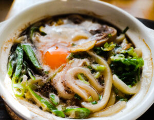 ② 鍋のうどん、これも冷凍焼けしていたものを海水よりもすこし薄い食塩水に1時間つけておきます。冷凍うどんは1時間水につけてもこしはしっかりあります。
