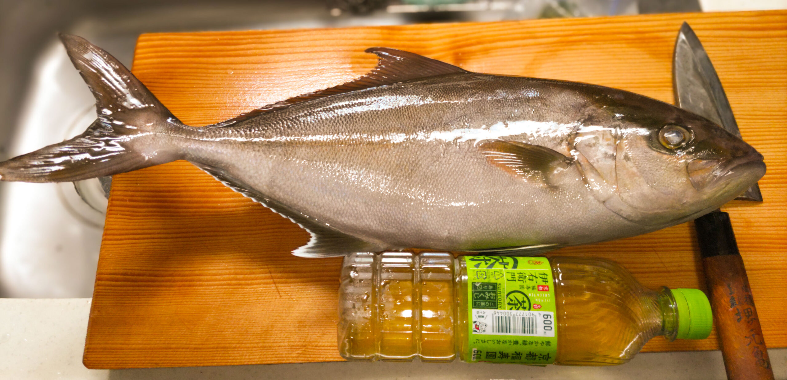 ってところでいつもの・・・台風並みの悪天候が明けての大潮。船長に聞くと前日から群れが入れ替わってカンパチも小ぶりになり、カッタクリが有利とのこと。やっぱりこれだ。泳がせはしつつも半分諦めてカッタクリも準備。大きめのカニバケ、サバ皮2本針にハリスフロロ5号。幸い、中乗さんが泳がせしながらカッタクリもいいよ!といってくれたから、両方準備する。